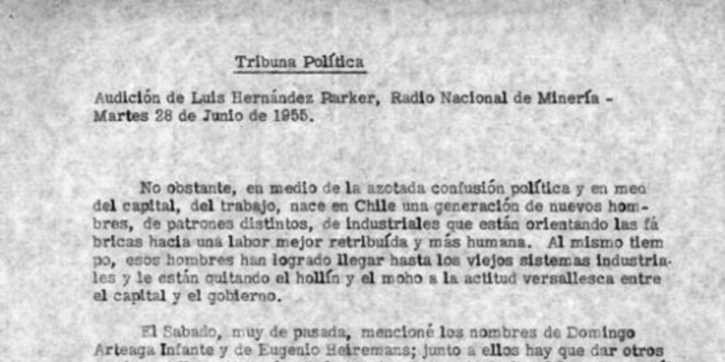 Tribuna Política [manuscrito]: Audición de Luis Hernández Parker, Radio Nacional de Minería