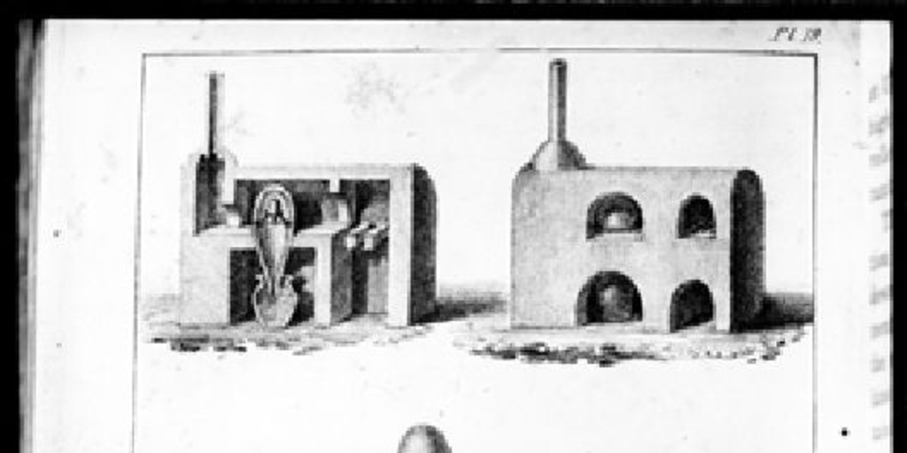 Ilustración que muestra el exterior e interior de un horno para la reducción de oro y plata
