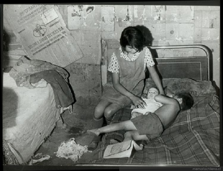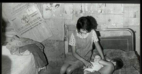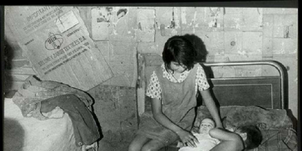Mujer junto a sus hijos en el interior de su mediagua, 1971