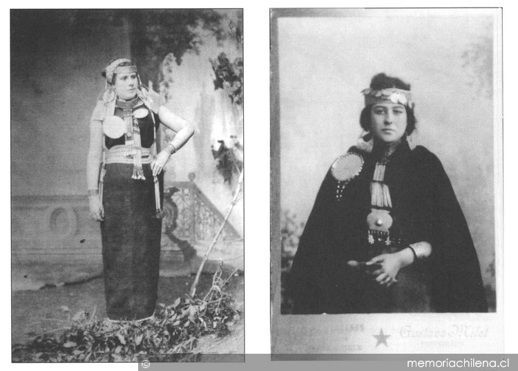 Mujeres vestidas con traje y joyas mapuche, hacia 1890