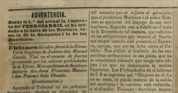 Dictamen del Sr. Fiscal de la Exma. Corte Suprema de Justicia don Manuel Camilo Vial en el recurso de fuerza promovido por los señores prebendados de la Iglesia Metropolitana de Santiago doctores don Juan Francisco Meneses i don Pascual Solis Obando