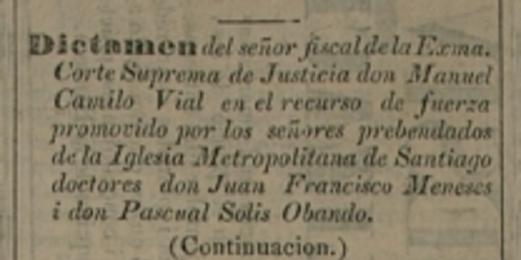 Dictamen del Sr. Fiscal de la Exma. Corte Suprema de Justicia don Manuel Camilo Vial en el recurso de fuerza promovido por los señores prebendados de la Iglesia Metropolitana de Santiago doctores don Juan Francisco Meneses i don Pascual Solis Obando