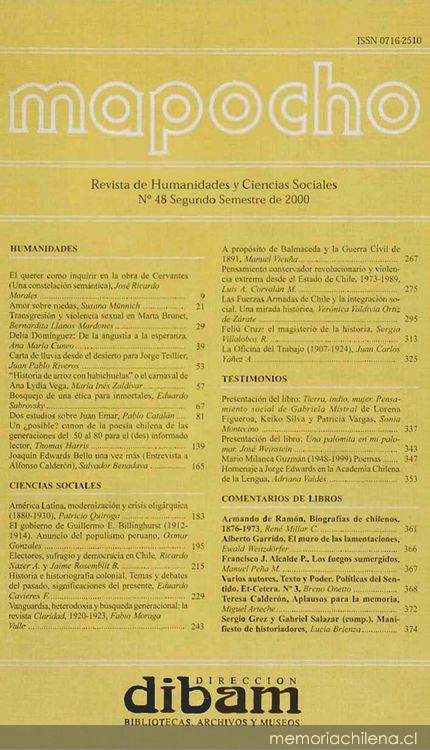 Mapocho / Biblioteca Nacional. Santiago : La Biblioteca, 1963- (Santiago : Universitaria) v., n° 48, (2000), p. 139-164