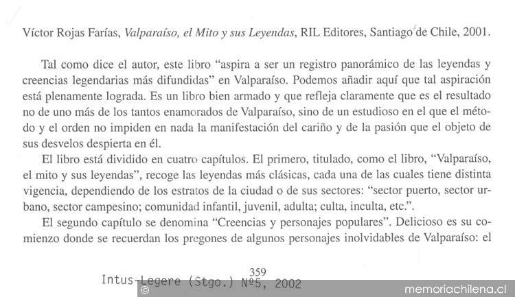Intus-Legere / Universidad Adolfo Ibañez, Instituto de Humanidades. Anuario de filosofía, historia y letras. Viña del Mar : Editorial Algarrobo, 1998- ([Santiago] : Universitaria) v., no. 5, (2002), p. 359