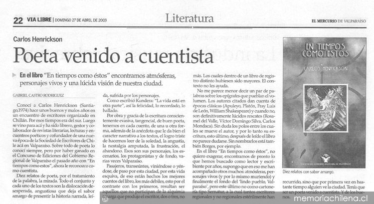 El Mercurio. Santiago : Talleres El Mercurio, 1900- . v., (27 abril 2003), p. 22