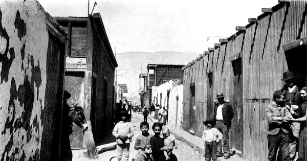 Niños y pobladores en calle principal del pueblo de La Noria, Tarapacá, hacia 1910