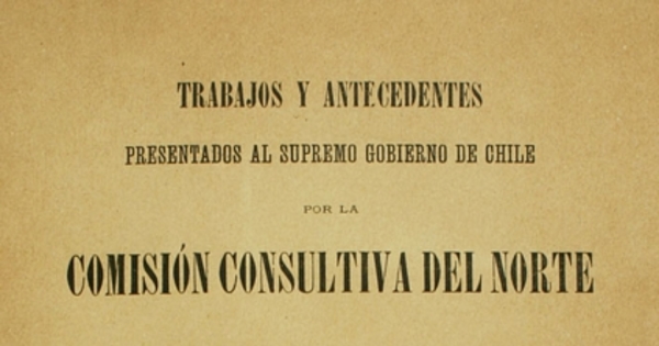 Trabajos y antecedentes presentados al Supremo Gobierno de Chile por la Comisión Consultiva del norte / recopilados por encargo del Ministerio del Interior por Manuel Salas Lavaqueý. Santiago de Chile : Impr. Cervantes, 1908. xvi, 898 p.