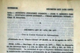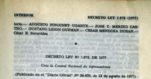 Decreto Ley N° 1.878 de 1977, Diario Oficial N° 29.836, 13 de agosto de 1977, que crea la Central Nacional de Informaciones