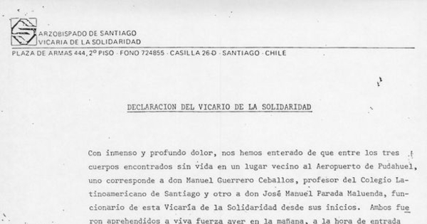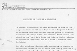 Declaración del Vicario de la Solidaridad, Santiago, 30 de marzo de 1985