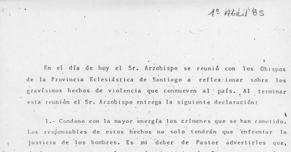 Reflexión sobre los gravísimos hechos de violencia que conmueven al país, 1 de abril de 1985