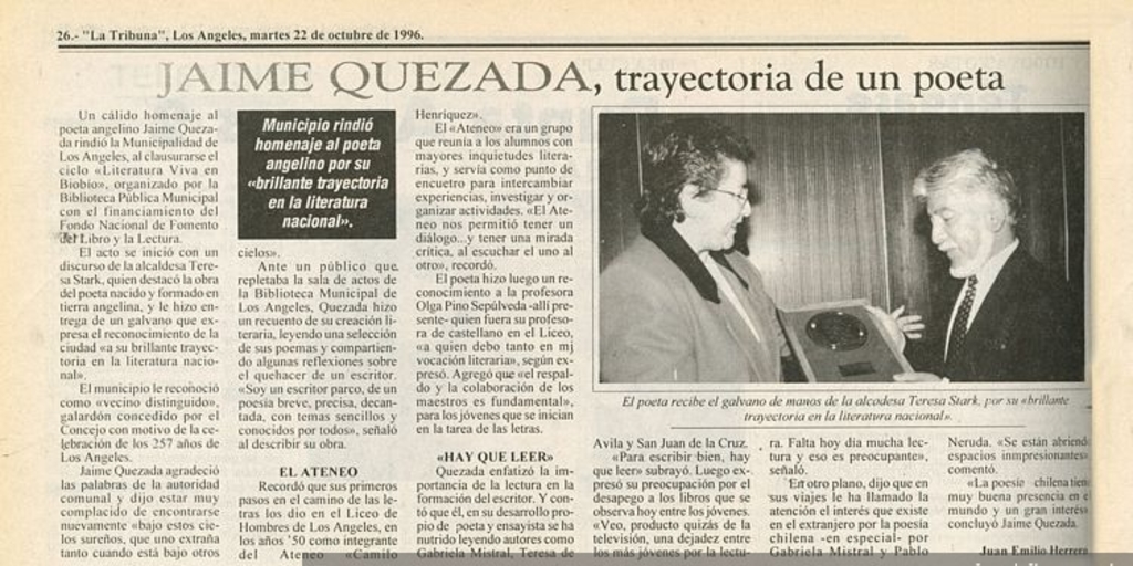 La Tribuna / Sociedad Periodística Bío-Bío. Los Angeles : La Sociedad, 1958- v., (22 oct. 1996), p. 26