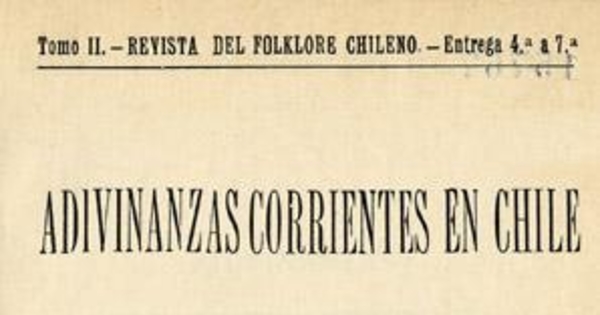Revista de folklore chileno :tomo II : 1911-1912 / publicada por la Sociedad de Folklore chileno de Santiago de Chile. Santiago : Impr. Cervantes, 1912. xliv p. Entregas 4 a 7, p. 138-334