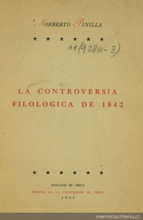 La controversia filológica de 1842 / Norberto Pinilla. Santiago de Chile : Universidad de Chile, 1945. xii, 116 páginas