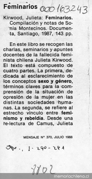 Mensaje. Santiago : [s.n.], 1951- (Santiago : Salesianos) v., no. 370, (jul. 1988), p. 290-291