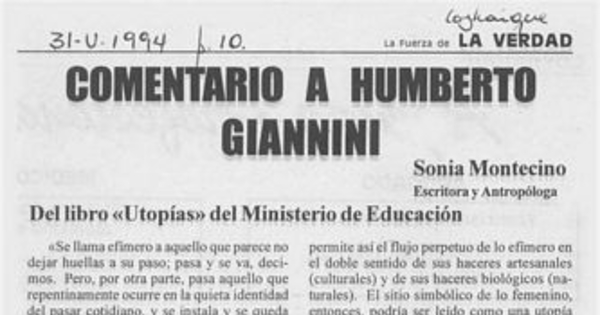 La Fuerza de la verdad. Coyhaique : La Verdad, 1994-1995. 328 nos., (31 mayo 1994), p. 10