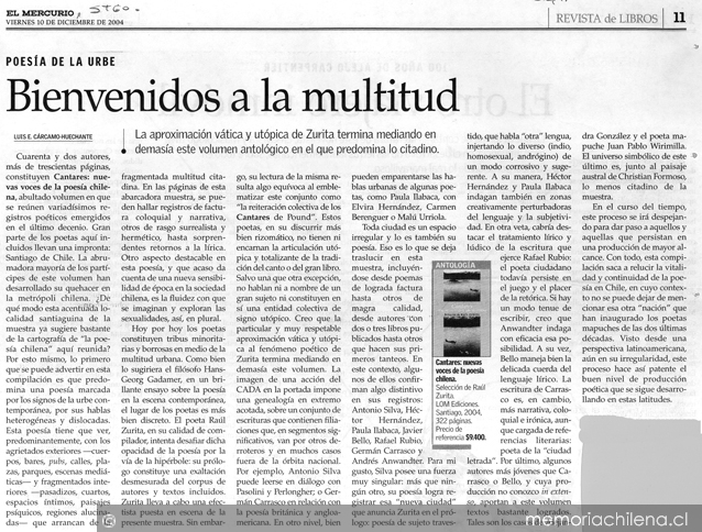 El Mercurio. Santiago : Talleres El Mercurio, 1900- . v., (10 dic. 2004), p. 11 (suplemento Revista de libros)