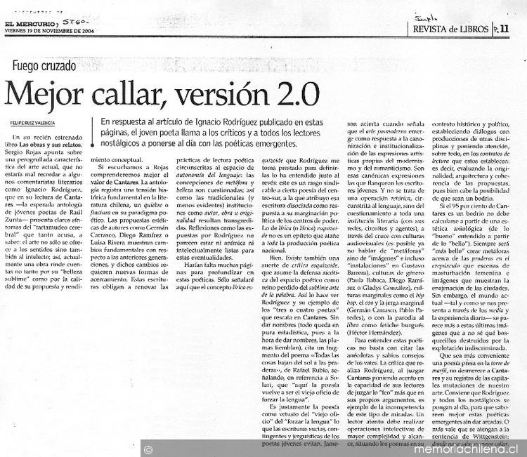 El Mercurio. Santiago : Talleres El Mercurio, 1900- . v., (19 nov. 2004), p. 11 (suplemento Revista de Libros)