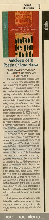 Materias: Teitelboim, Volodia, 1916- . Antología de Poesía Chilena NuevaAnguita, Eduardo, 1914-1992. Antología de Poesía Chilena Nueva
