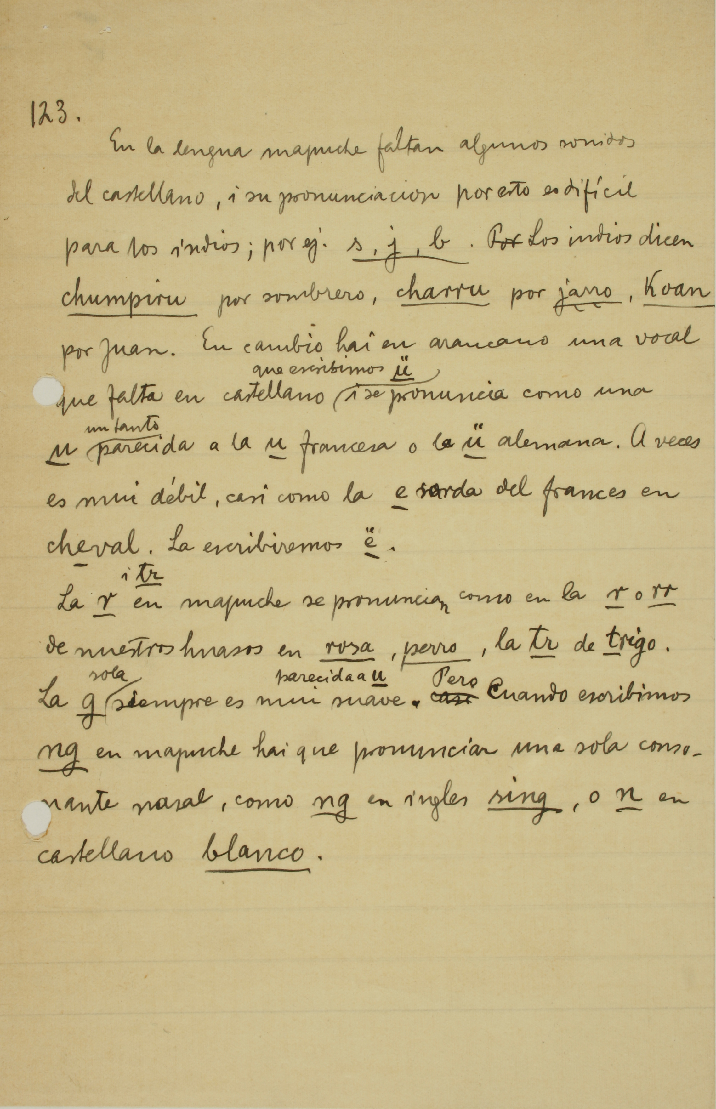 Documento manuscrito sobre sonidos mapuches Documento pertenece al Fondo Rodolfo Lenz de la UMCE