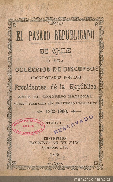 El Pasado republicano de Chile, o sea, Colección de discursos pronunciados por los Presidentes de la República ante el Congreso Nacional al inaugurarse cada año el período legislativo : 1832-1900. Concepción : Impr. de El País, 1899. 2 v.