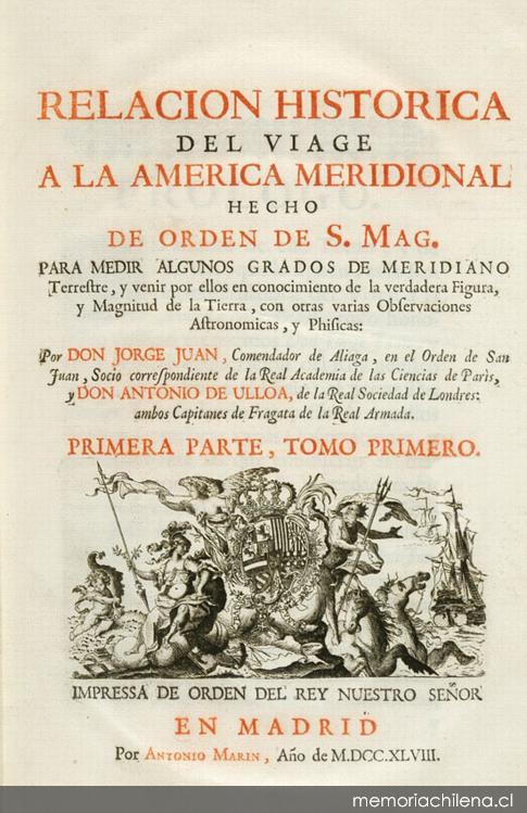 Relacion historica del viage a la America meridional hecho de orden de S. Mag. para medir algunos grados de meridiano terrestre y venir por ellos en conocimento de la verdadera figura, y magnitud de la tierra, con otras varias observaciones astronomicas y phisicas. Madrid: por Antonio Marin, 1748, 2 volúmenes. Parte primera, tomo I