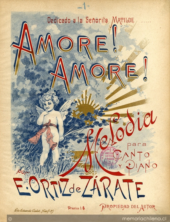 Amore Amore! [música] : melodía para canto y piano / por E. Ortíz de Zárate. [Santiago] : Lit. Eduardo Cadot, [19--] 1 partitura (4 p.) ; 34 cm.