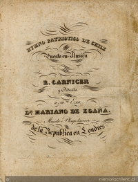 Hymno patriótico de Chile [música] : [para canto y piano] / puesto en música por R. Carnicer y dedicado a su Exo. Dn. Mariano Egaña, Ministro Plenipotenciario de la República en Londres. Londres : [S. n.], [1828] 1 partitura (5 p.)