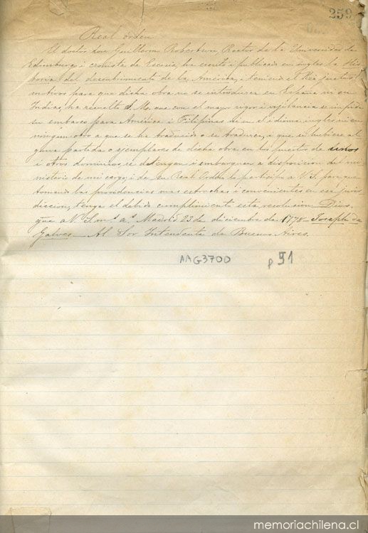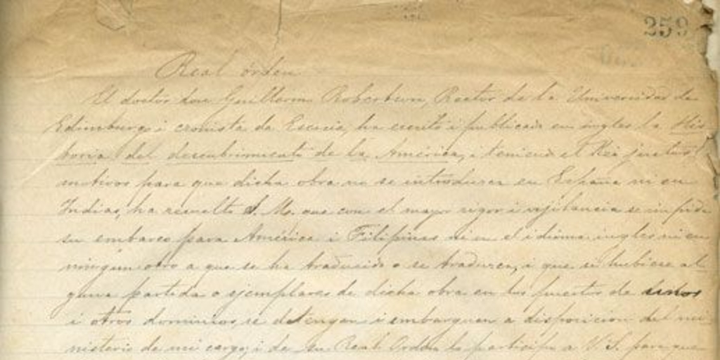 Real Orden. El doctor don Guillermo Robertson, Rector de la Universidad de Edimburgo i cronista de Escosia, ha escrito i publicado en ingles la "Historia del descubrimiento de la América" i temiendo el Rei justos motivos para que dicha obra no se introduzca en España ni en Indias ...[manuscrito]