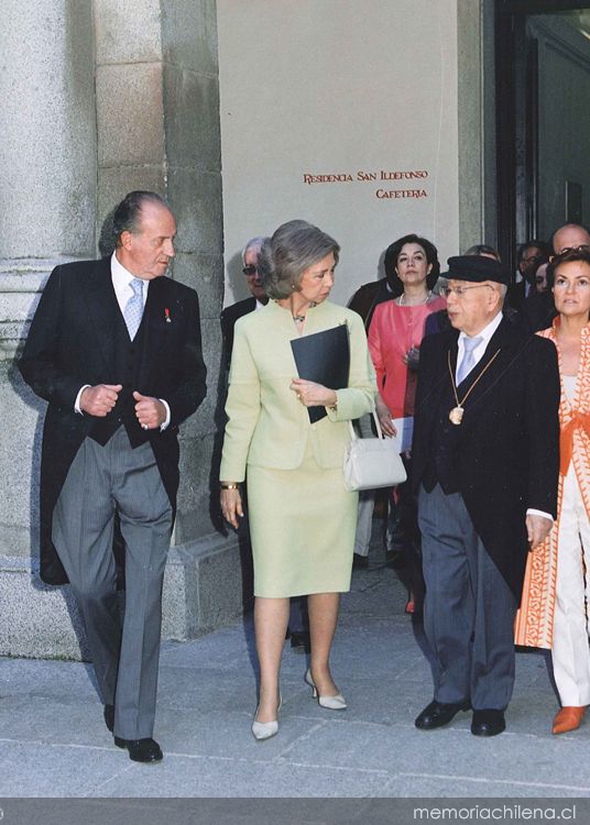 Gonzalo Rojas saliendo del Paraninfo de la Universidad de Alcalá de Henares luego de recibir el Premio Cervantes 2003, acompañado de los Reyes de España, 23 de abril de 2004