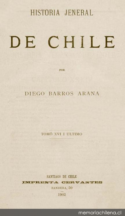 Historia jeneral de Chile / por Diego Barros Arana. Santiago : Rafael Jover editor, 1884-1902. 16 volúmenes, [66] páginas de láminas (algunas plegadas)