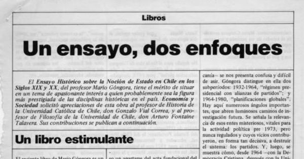 Materias: Autores ChilenosGóngora, Mario, 1915-1985. Ensayo Histórico Sobre la Noción de Estado de Chile en los Siglos XIX y XX