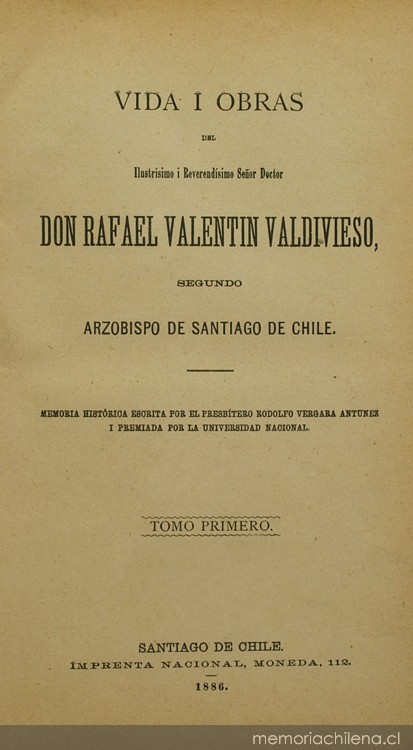 Vida i obras del ilustrísimo i reverendísimo señor doctor don Rafael Valentín Valdivieso, segundo arzobispo de Santiago de Chile
