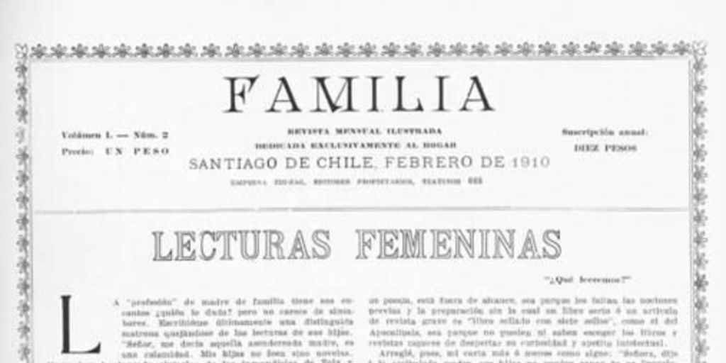 Familia. Santiago : Zig-Zag, 1910-1928, volúmenes, volumen I, número 2 (febrero 1910), página 1