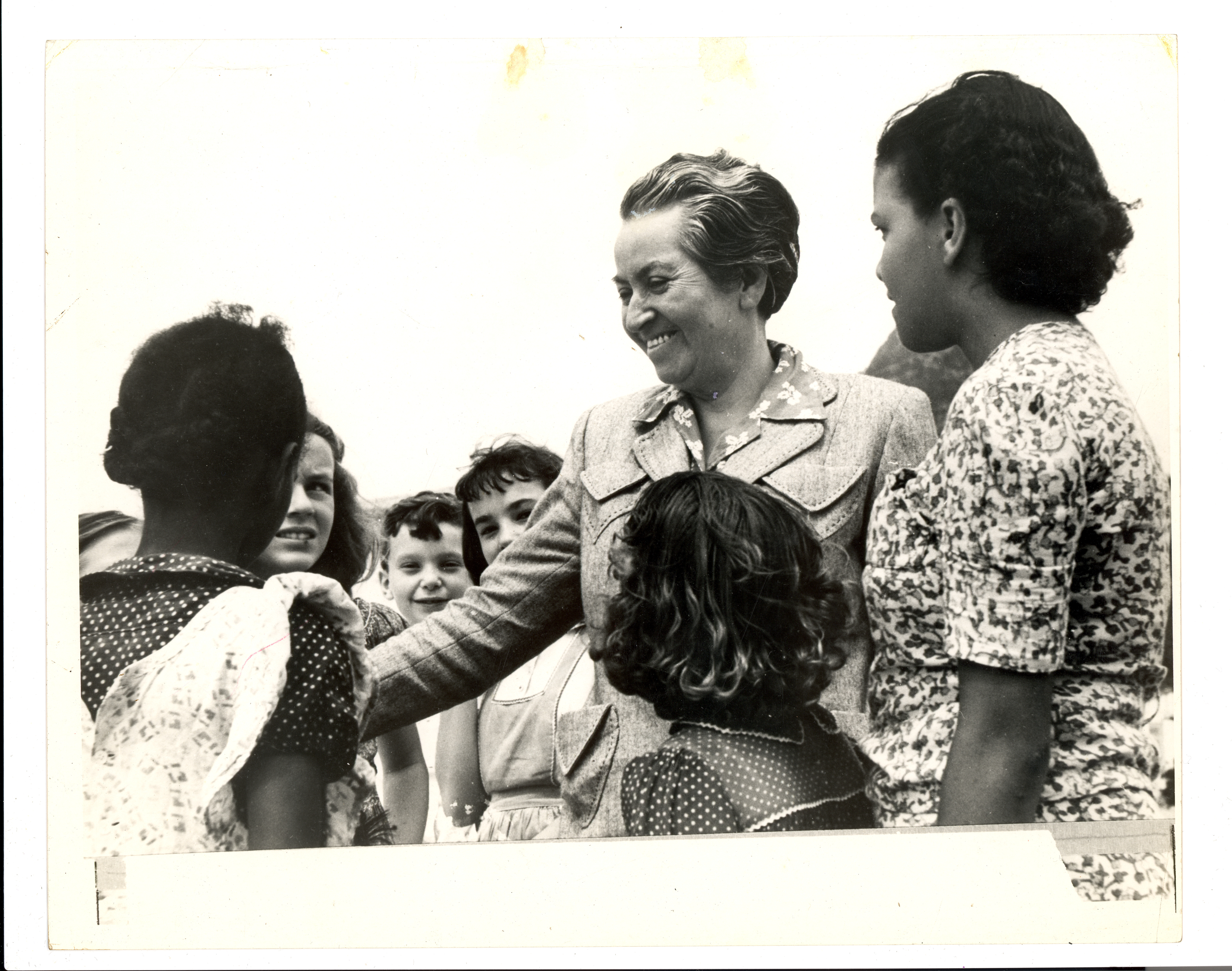 Texto en el reverso del original: "Gabriela Mistral; famous for her poems & stories for children and her work for UNICEF, the 'bard of mother and children' talks to a group of children. Credit - Doris Dana. ·# 19"