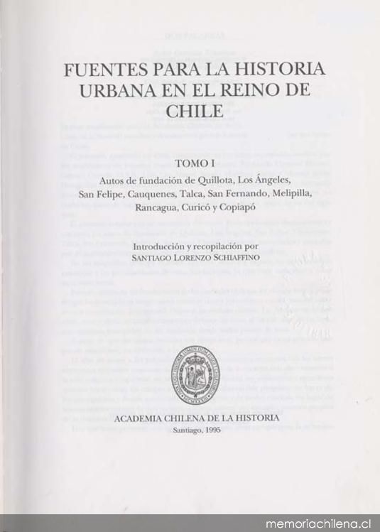 Fuentes para la historia urbana en el reino de Chile / introducción y recopilación por Santiago Lorenzo Schiaffino. Santiago : Academia Chilena de la Historia, 1995 (Santiago : Universitaria), volúmenes