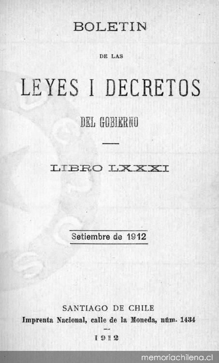 Boletín de las leyes i decretos del gobierno. Libro LXXXI (sep. 1912), pp. 1226-1231.