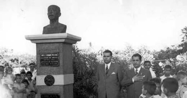 Cónsul de Chile, Carlos Lamas, junto al busto de la tumba de José Toribio Medina, en celebración de su centenario