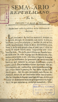 Continuación del Semanario republicano. Santiago :Impr. de Gobierno, p[or] D. J.C. Gallardo,1813-1814. 1 v. ;19 cm.
