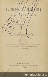 El alcohol, el alcoholismo i su represión. Santiago :Imprenta Nacional,1899. 305 páginas, [6] láminas ;23 cm