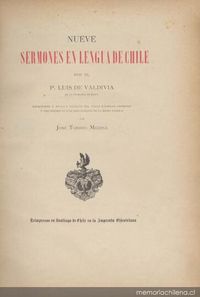Nueve sermones en lengua de Chile por el P. Luis de Valdivia : reimpresos a plana y renglón del único ejemplar conocido y precedidos de una Bibliografía de la misma lengua. Santiago :Impr. Elzeviriana,1897. 77 p. ;8o.