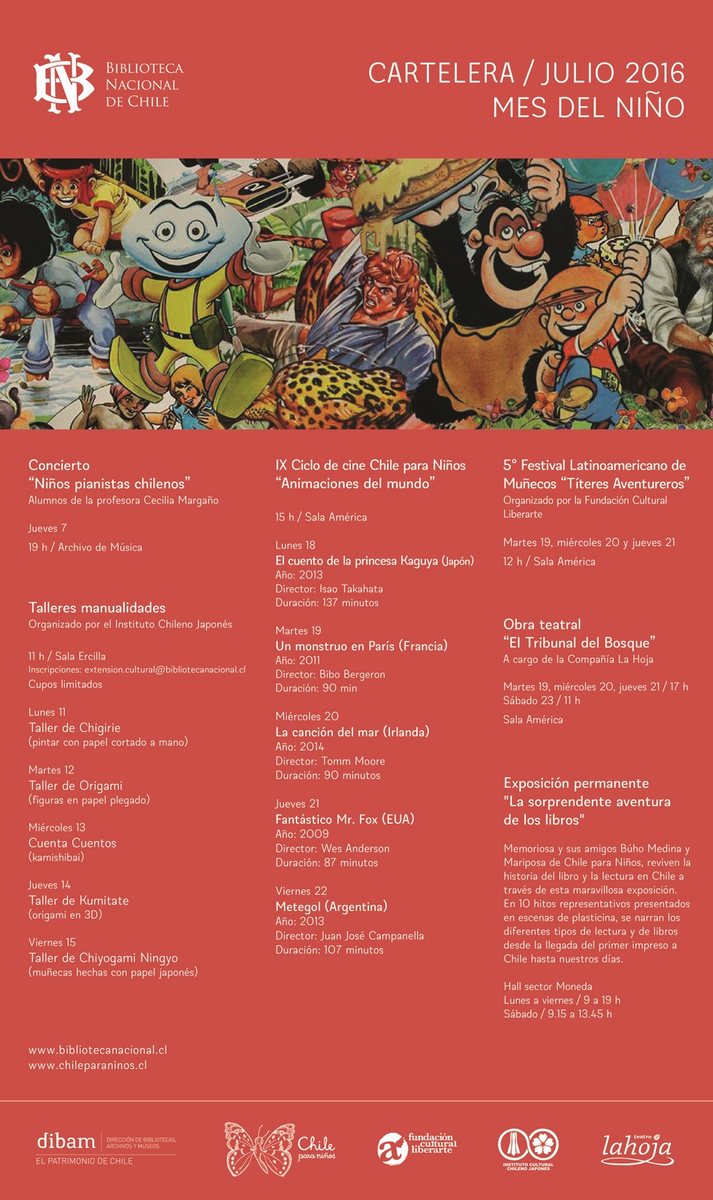 Chile para Niños de la Biblioteca Nacional, en conjunto con el Departamento de Cultura y Comunicaciones de la BN, la Fundación Cultural Liberarte, el Instituto Chileno-Japonés de Cultura y la Compañía La Hoja, presentan una serie de actividades con las que podrán escapar del frío del invierno y, al mismo tiempo, disfrutar en familia.